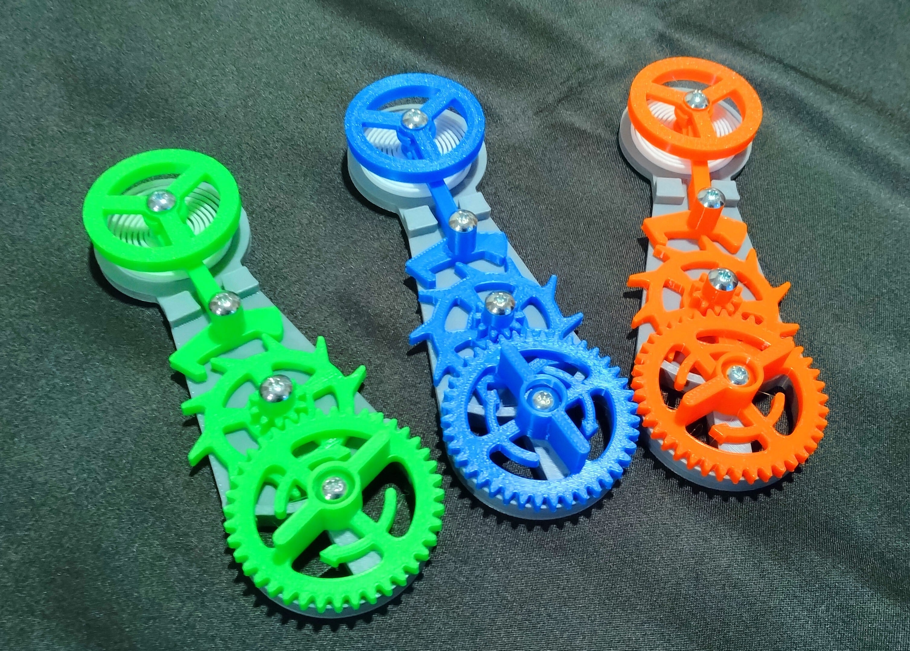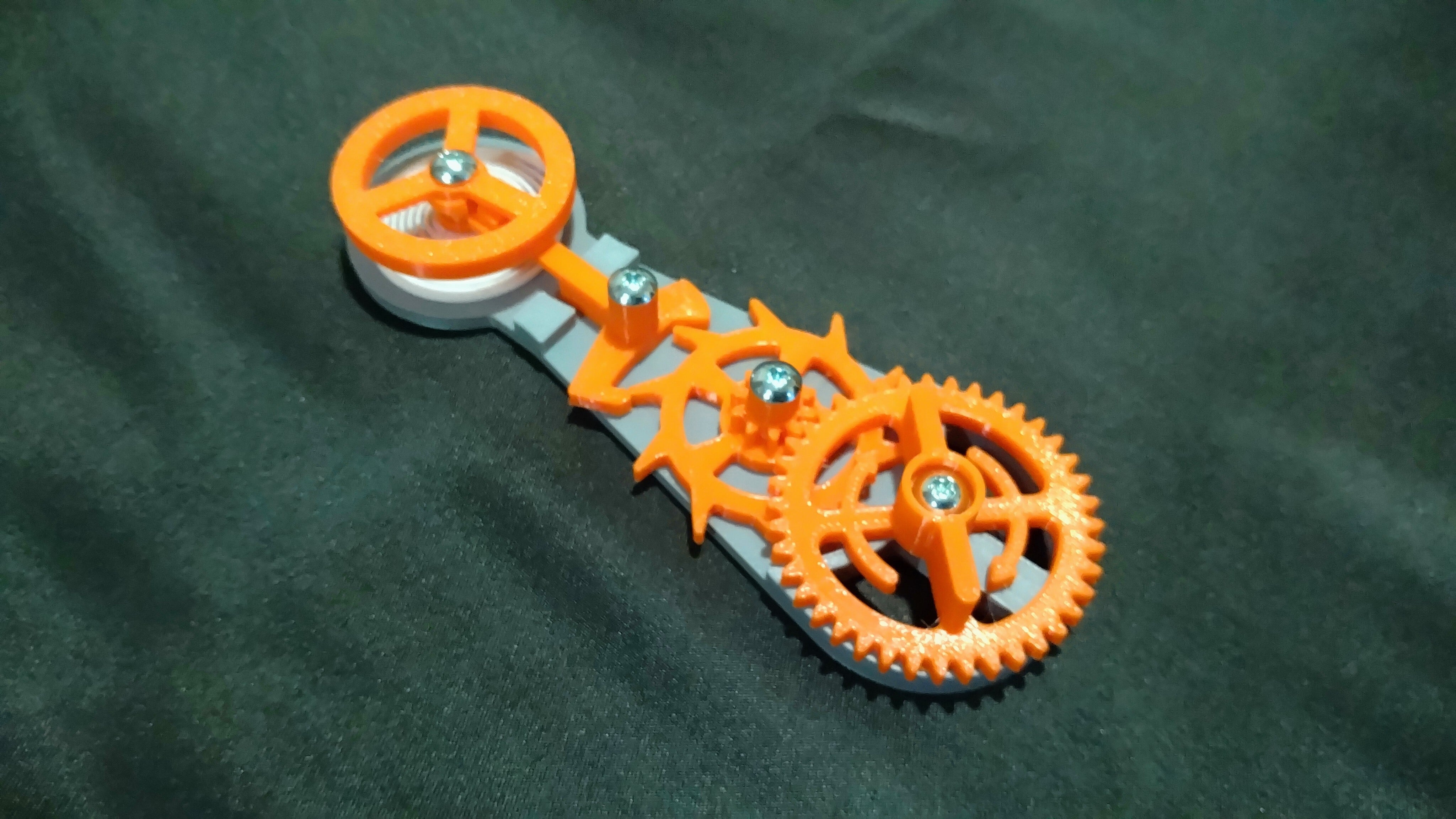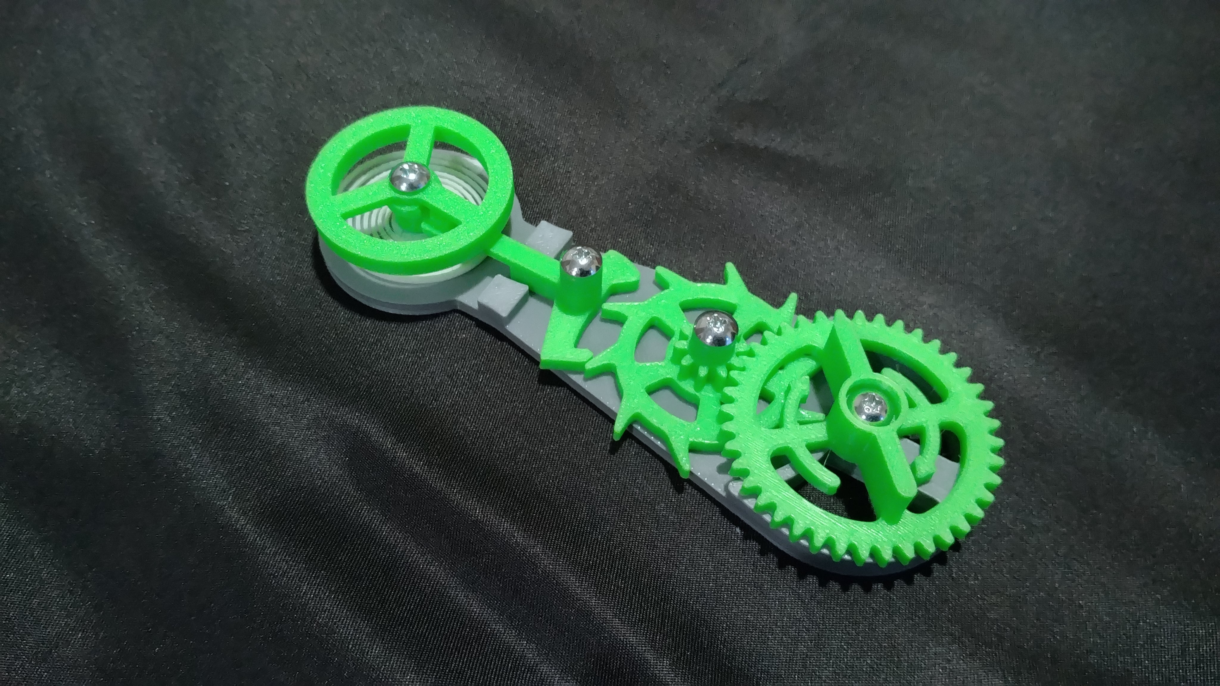大きな歯車を右回転させることで脱進機の運動を観察できます。